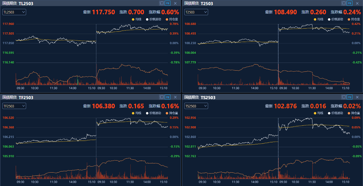 国债期货集体上行,截至收盘,30年期主力合约涨0.60%,10年期主力合约涨0.24%,5年期主力合约涨0.16%,均创收盘价新高。此外,2年期主力合约涨0.02%,盘中续刷历史新高。