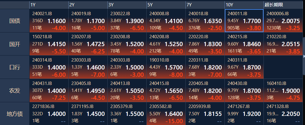【大河财立方消息】12月13日,A股市场单边下跌,股债跷跷板效应凸显,债市继续上行,10年期国债活跃券(240011)收益率下破1.8%,截至发稿,收益率触及1.7700%。