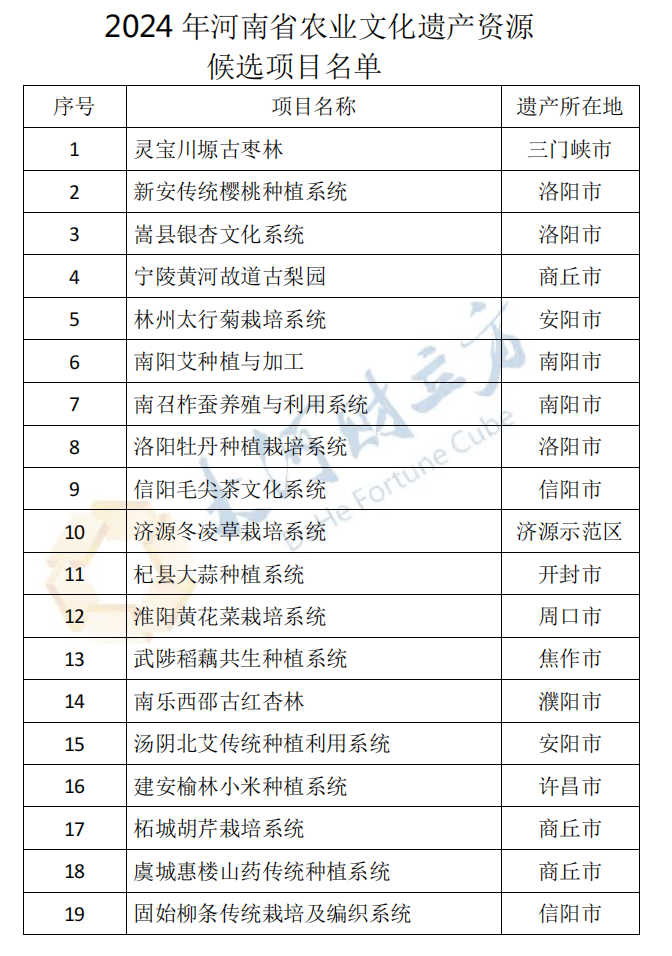【大河财立方消息】12月14日消息,经县级申报、市级推荐、省级初审和专家评议,河南省农业农村厅拟将灵宝川塬古枣林、信阳毛尖茶文化系统、杞县大蒜种植系统等19个项目列入2024年河南省农业文化遗产资源候选项目名单。公示期自2024年12月13日至2024年12月17日。