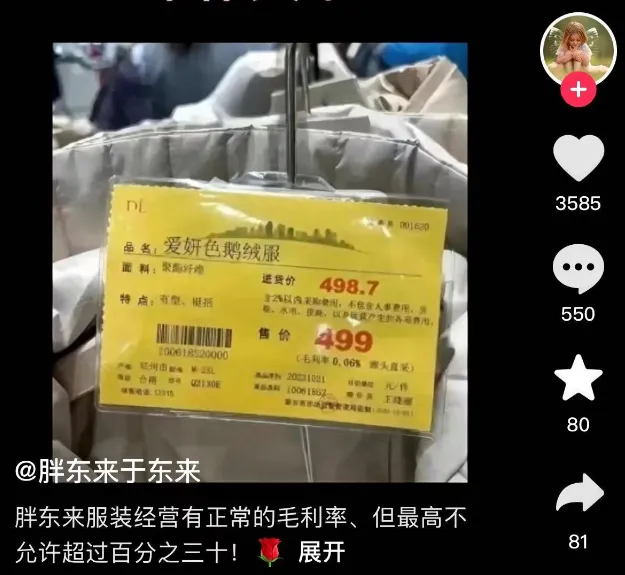 【大河财立方 记者 徐姣】12月17日,胖东来创始人于东来,在其抖音号上回应了关于胖东来羽绒服仅赚3毛的相关言论:“这个是处理商品价格,不要误读!胖东来服装经营有正常的毛利率,但最高不允许超过30%。”