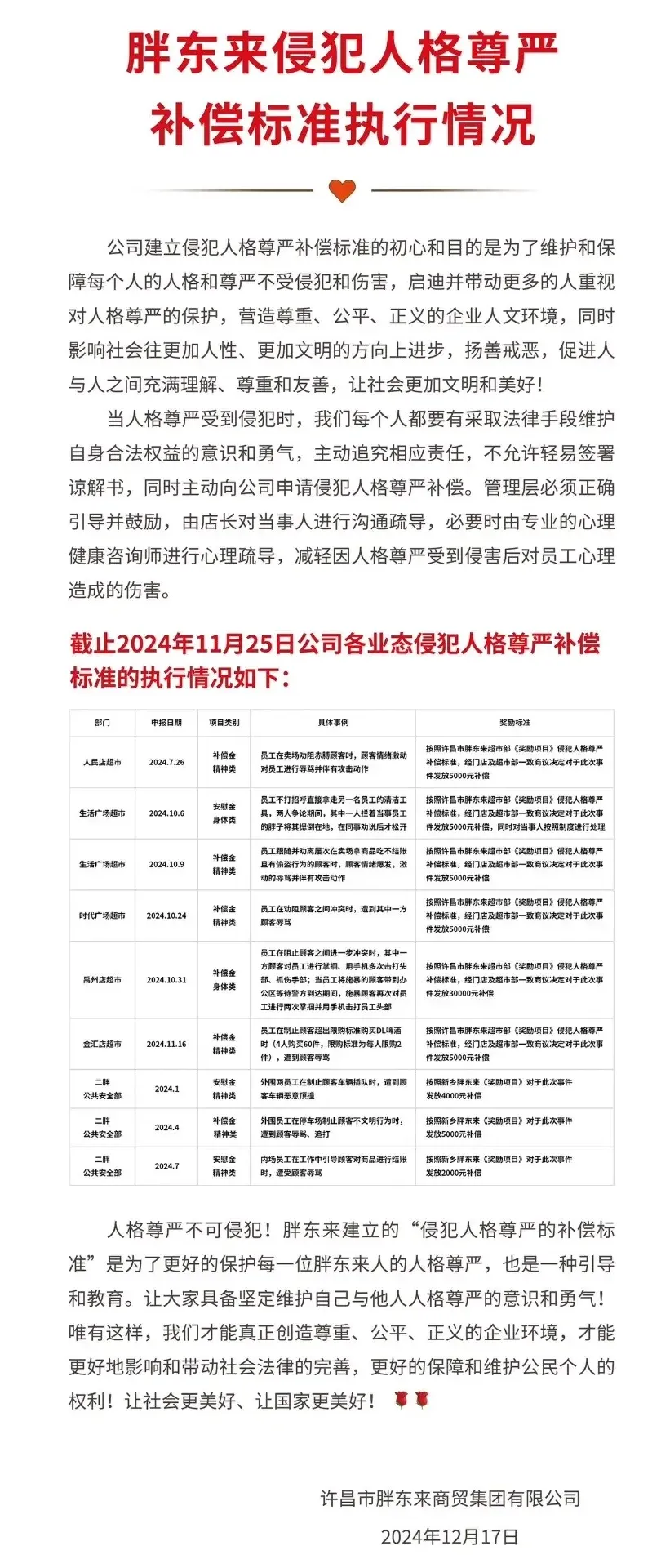 同日,于东来还发布了“胖东来人格尊严补偿标准执行情况”,并公示了截至2024年11月25日,公司各业态侵犯人格尊严补偿标准的执行情况。