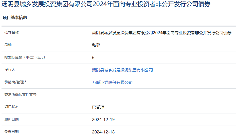 【大河财立方消息】12月19日,汤阴县城乡发展投资集团有限公司2024年面向专业投资者非公开发行公司债券获上交所受理。