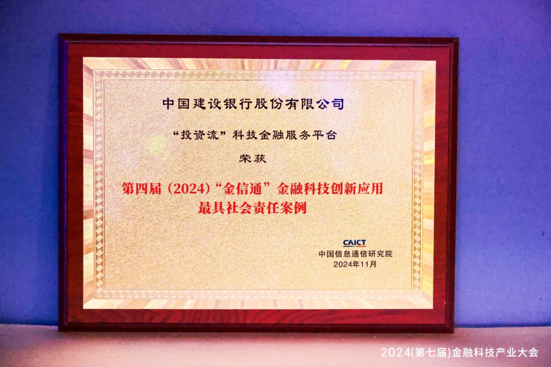 【大河财立方消息】近日,由中国通信标准化协会主办、中国信息通信研究院承办的第七届金融科技产业大会在北京召开,并公布了第四届(2024)“金信通”金融科技创新应用案例评选结果,建设银行“投资流”科技金融服务平台获评“最具社会责任案例”。