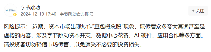 【大河财立方消息】12月19日,字节跳动发布风险提示称,资本市场近期出现炒作“豆包概念股”现象,流传着众多夸大其词甚至是虚构的内容,涉及字节跳动资本开支、数据中心花费、AI硬件、应用合作等多方面。对此,字节跳动提示投资者,切勿轻信市场传言,以免遭受不必要的投资损失。