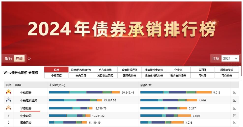 Wind数据显示,截至2024年12月19日,95家券商投行披露承销数据,其中华泰证券股份有限公司(以下简称华泰证券)实现承销规模12749.78亿元,仅次于中信证券、中信建投证券,位居行业第三名。