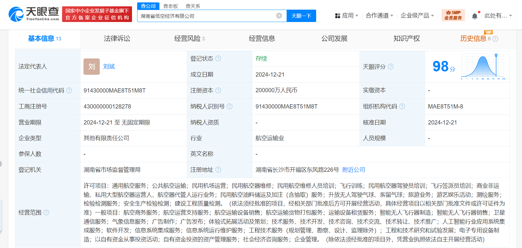 【大河财立方消息】天眼查App显示,近日,湖南省低空经济有限公司成立,法定代表人为刘斌,注册资本20亿元,经营范围含通用航空服务、公共航空运输、航空器代管人运行业务、升放无人驾驶气球、航空商务服务、航空运营支持服务、智能无人飞行器制造等。