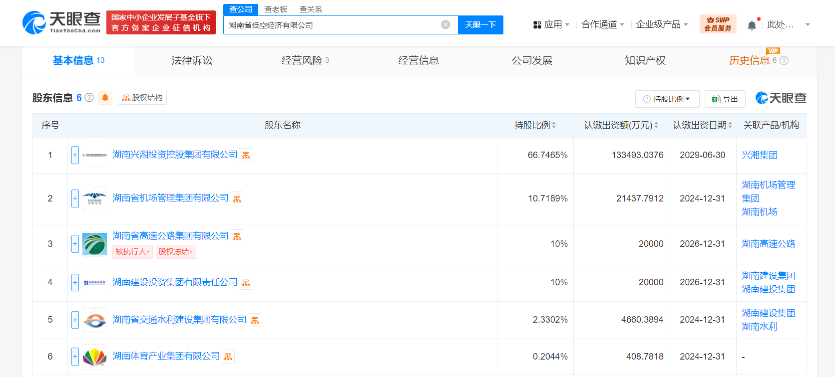 股东信息显示,该公司由湖南兴湘投资控股集团有限公司、湖南省机场管理集团有限公司、湖南省高速公路集团有限公司、湖南省建设投资集团有限责任公司、湖南省交通水利建设集团有限公司、湖南体育产业集团有限公司等6位股东共同持股。