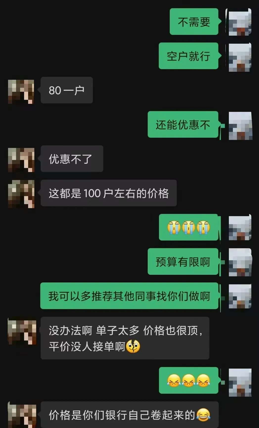 记者以某家银行职员为名联系到一个商家,她对记者表示,80元开通一户,无法优惠,平价没人接单。另一个商家则表示,做不同的银行收费不等,有的银行做一户市场要价已高达110元。