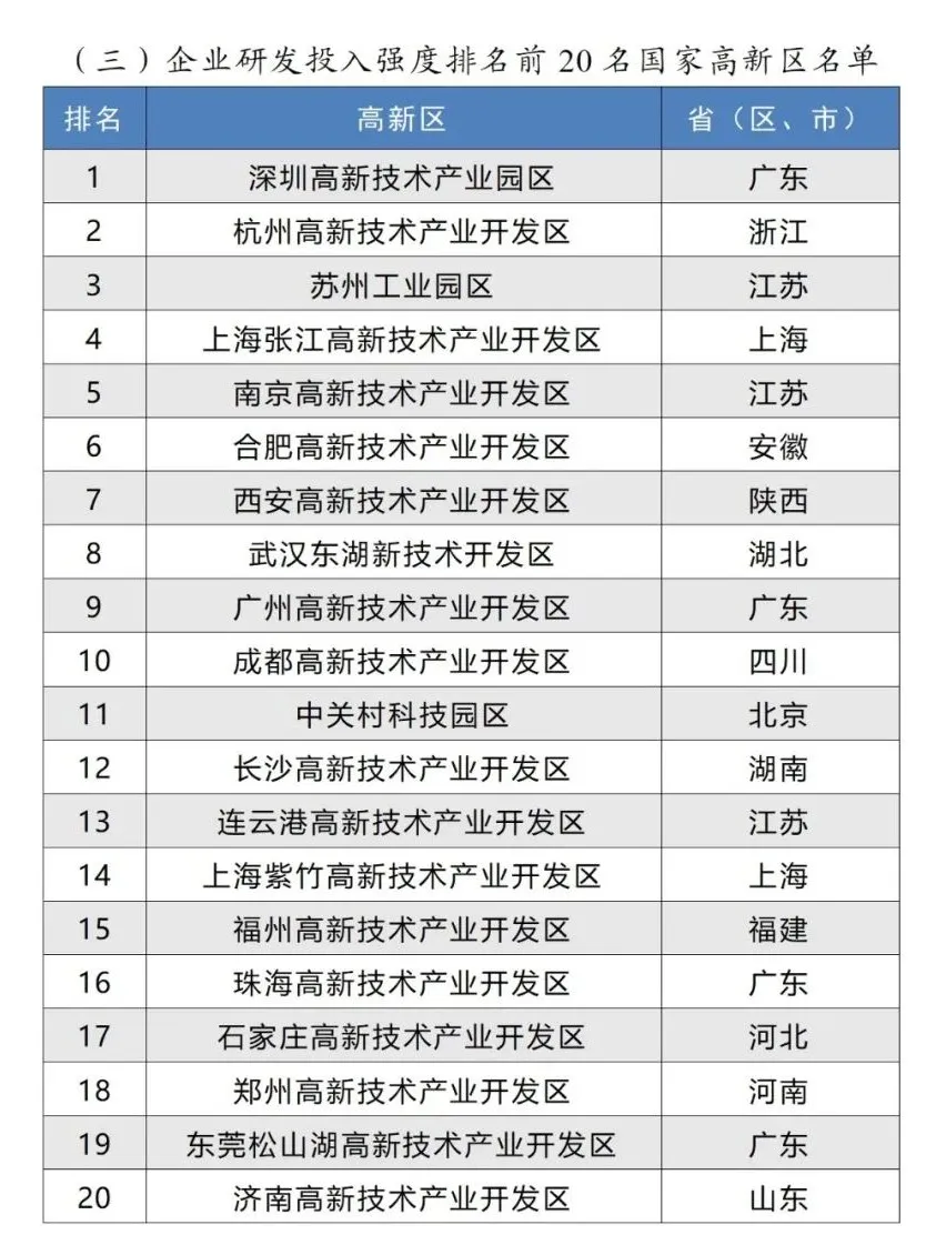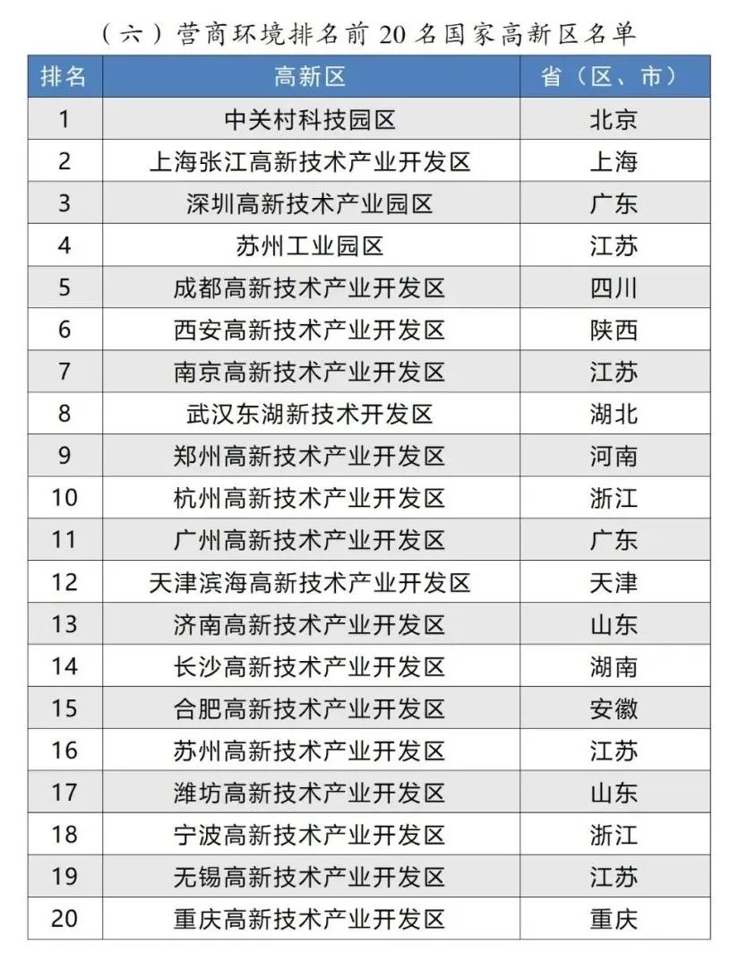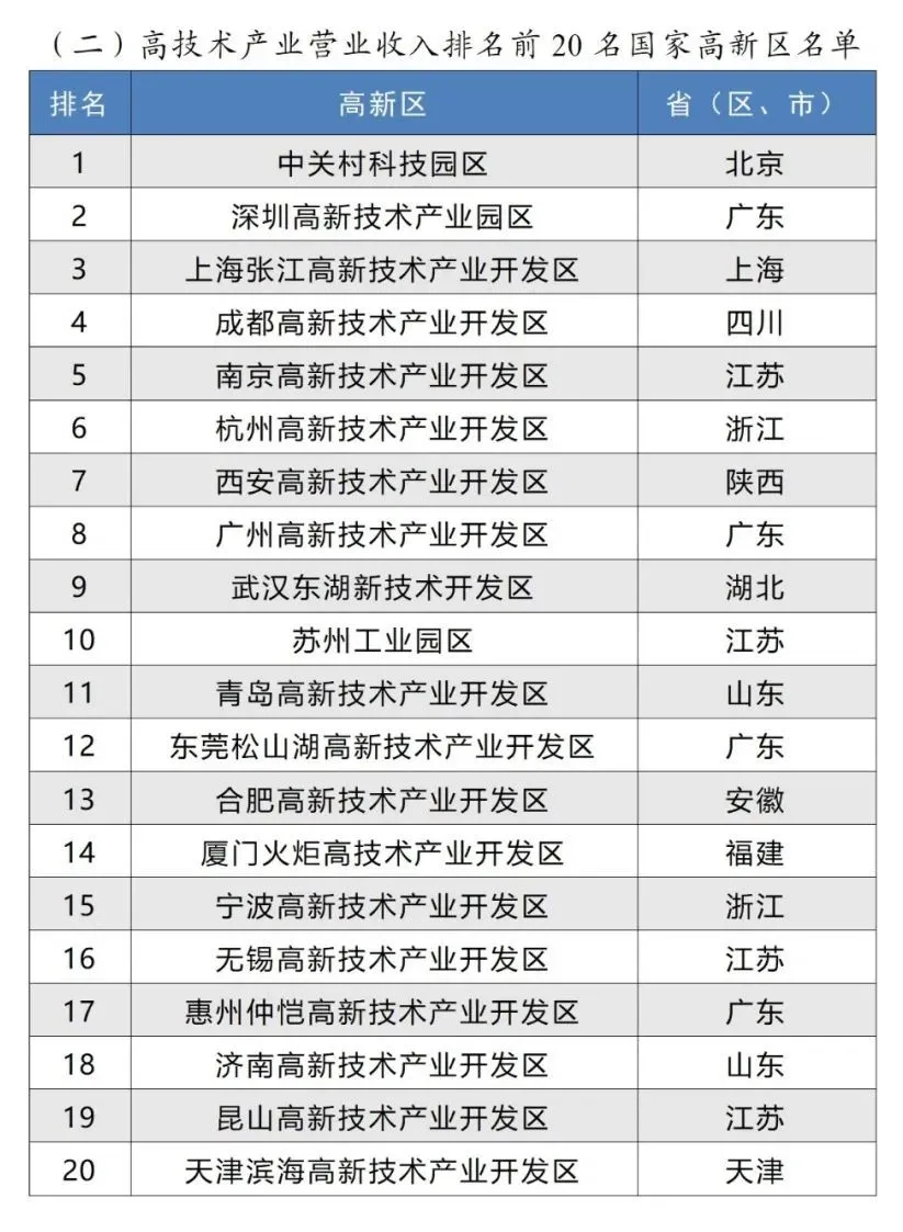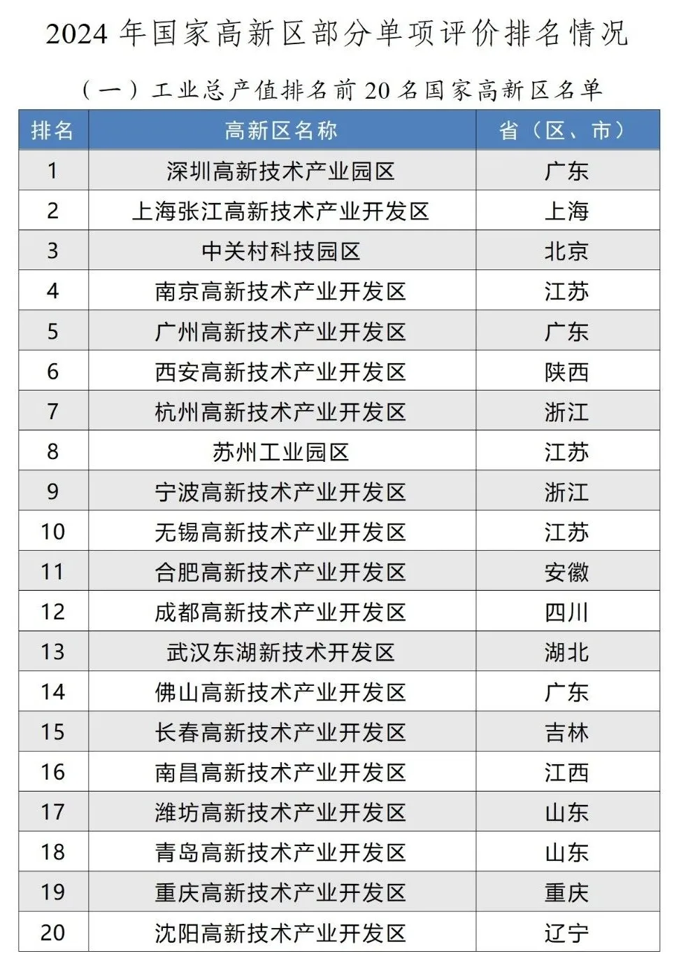 名单显示,2024年国家高新区综合评价前三名为中关村科技园区、深圳高新技术产业园区、上海张江高新技术产业开发区。