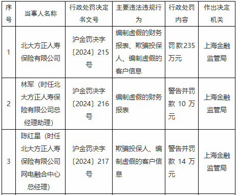 时任北大方正人寿保险有限公司总经理助理林军对编制虚假的财务报表负有责任,被予警告并处罚款10万元;时任北大方正人寿保险有限公司网电融合中心总经理陈红星对欺骗投保人、编制虚假的客户信息负有责任,被予以警告并处罚款14万元。
