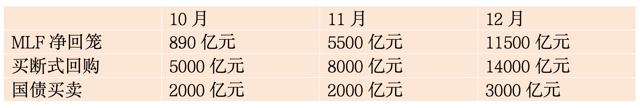 其中,10月、11月、12月MLF操作分别净回笼890亿元、5500亿元、1.15万亿元;同期人民银行开展买断式逆回购操作为5000亿元、8000亿元、1.4万亿元,开展公开市场国债买卖操作为2000亿元、2000亿元、3000亿元。