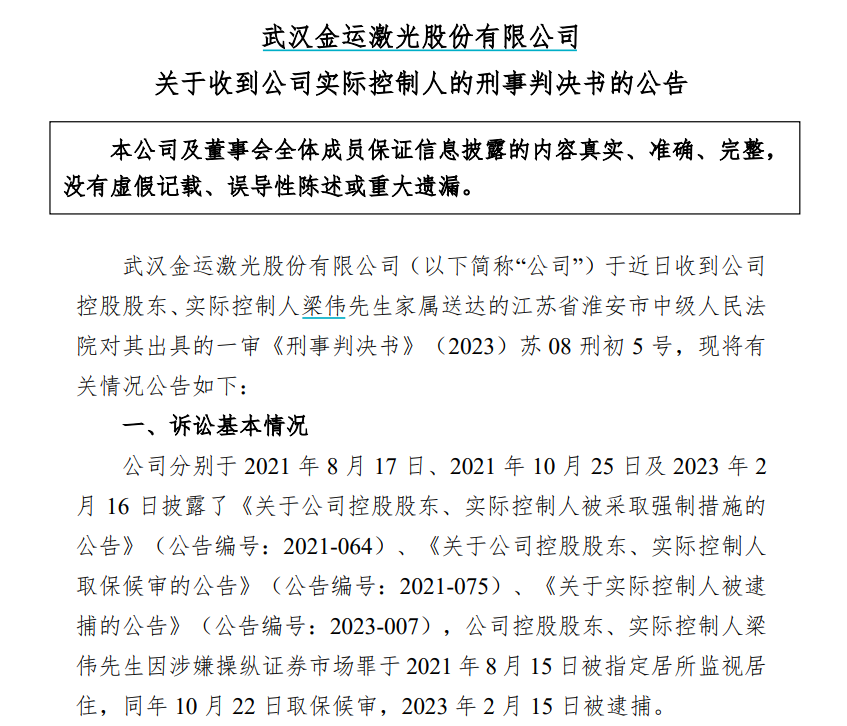 根据公告,金运激光控股股东、实际控制人梁伟因涉嫌操纵证券市场罪于2021年8月15日被指定居所监视居住,同年10月22日取保候审,2023年2月15日被逮捕。