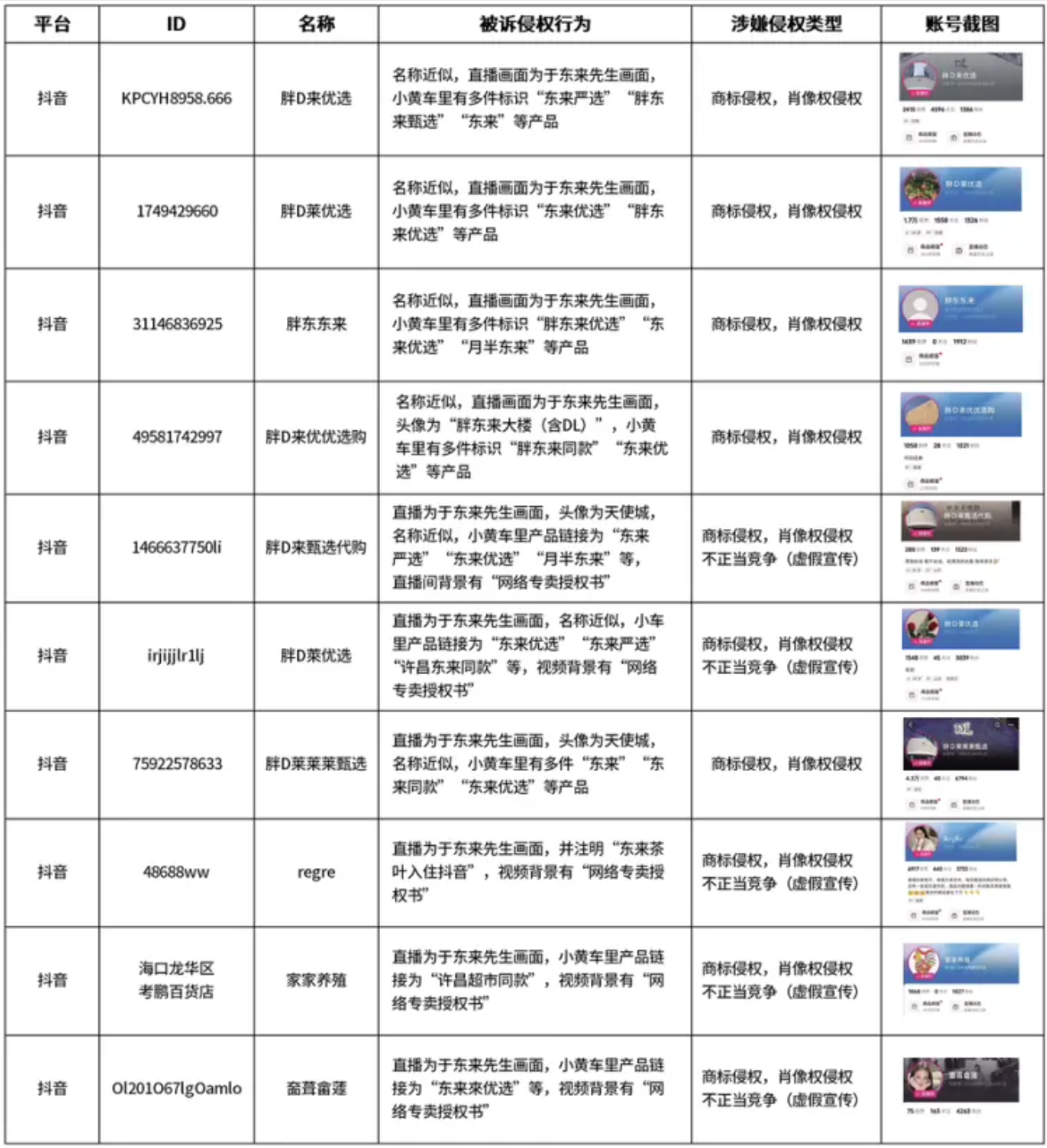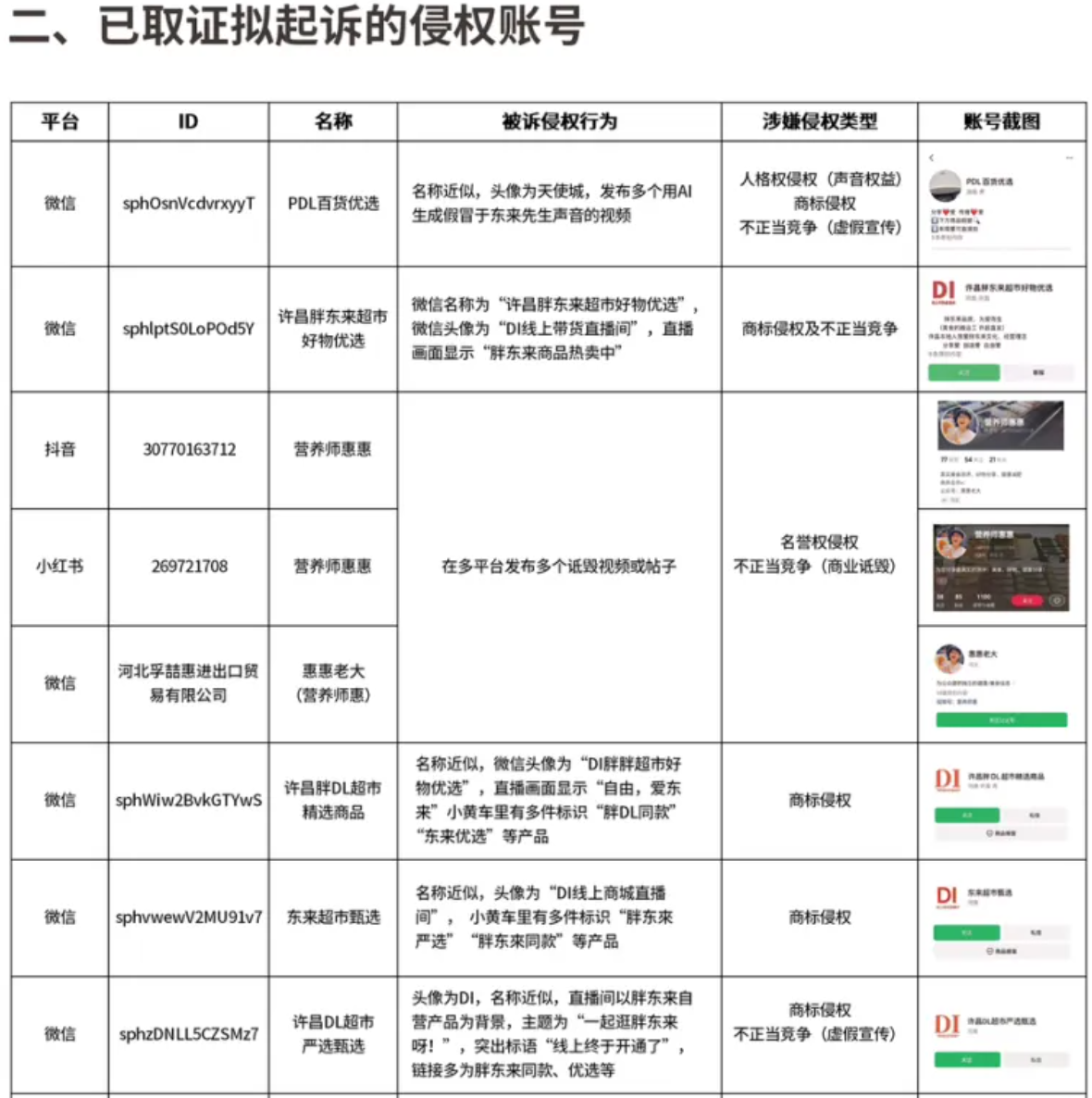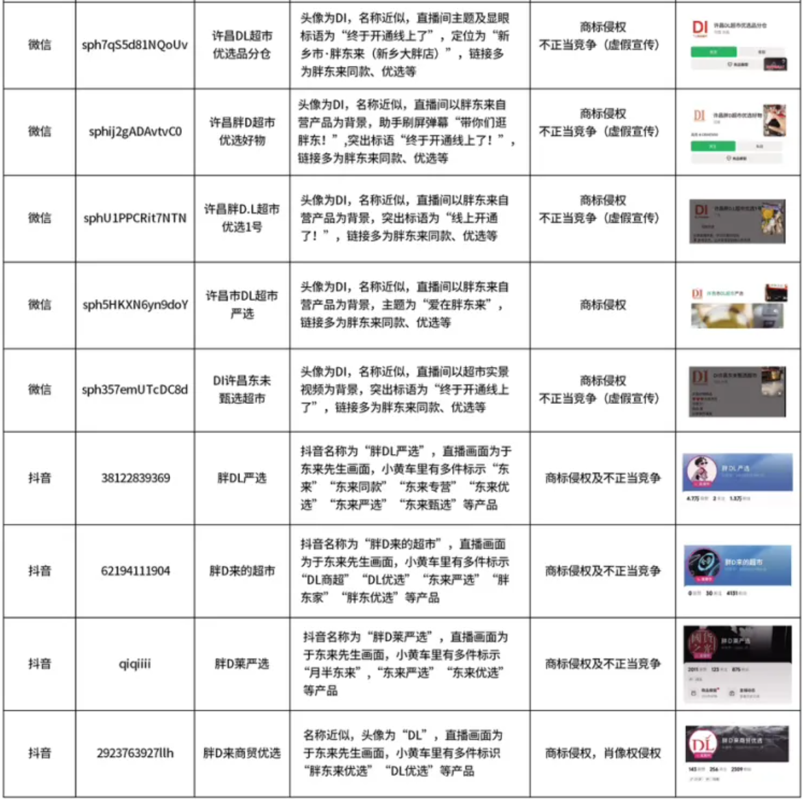 记者注意到,胖东来已取证拟起诉的侵权账号包括:“许昌胖东来超市好物优选”“东来超市甄选”“胖DL严选”等,分布在微信、抖音、小红书等平台。