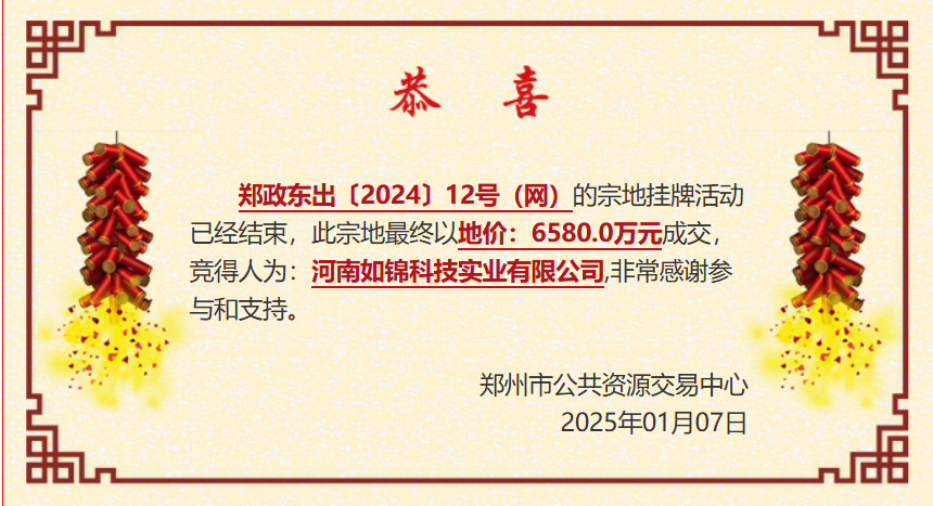 其中,郑政东出〔2024〕12号(网)位于郑东新区龙湖中环北路南、龙源西一街西,使用权面积12470.04平方米(约18.71亩),成交价6580万元,由河南如锦科技实业有限公司竞得。