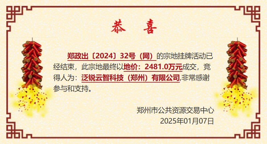 郑政出〔2024〕32号(网)地块位于秦岭路西、棉纺西路北,使用权面积15430.49平方米(约23.15亩),成交价2481万元,由泛锐云智科技(郑州)有限公司竞得。