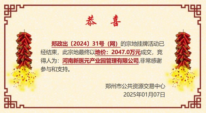 郑政出〔2024〕31号(网)地块位于秦岭路西、热电厂西路北,使用权面积10353.53平方米(约15.53亩),成交价2047万元,由河南新医元产业园管理有限公司竞得。
