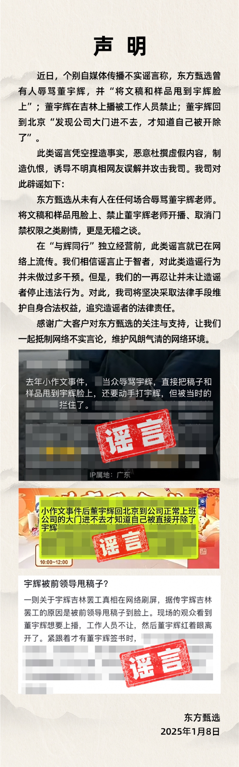 声明中还提到,在“与辉同行”独立经营前,此类言论就已在网络上流传,而东方甄选并未对此类造谣行为并未做过多干预,但此类言论也并未停止。对此,东方甄选表示,将坚决采取法律手段维护自身合法权益,追究造谣者的法律责任。