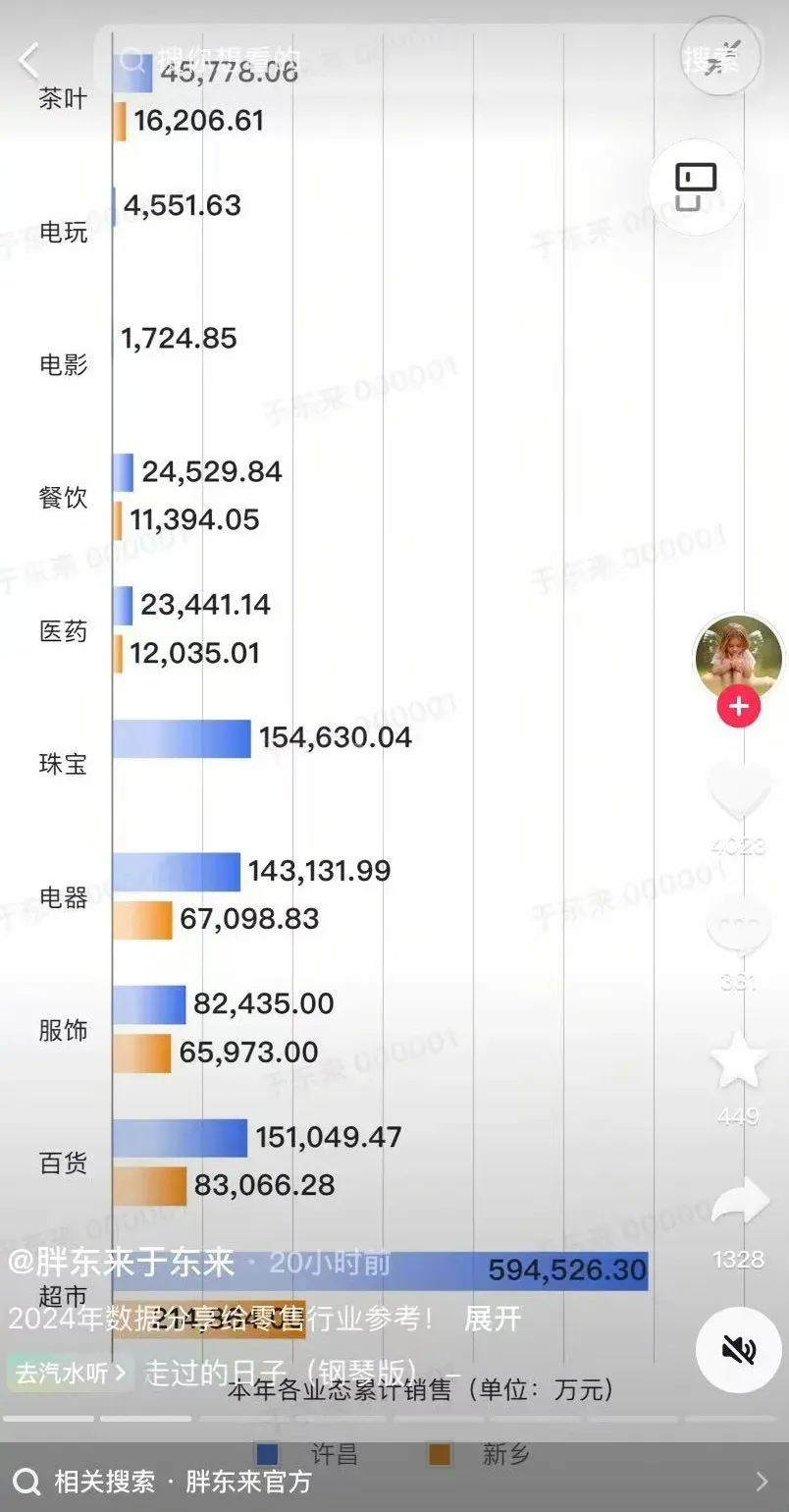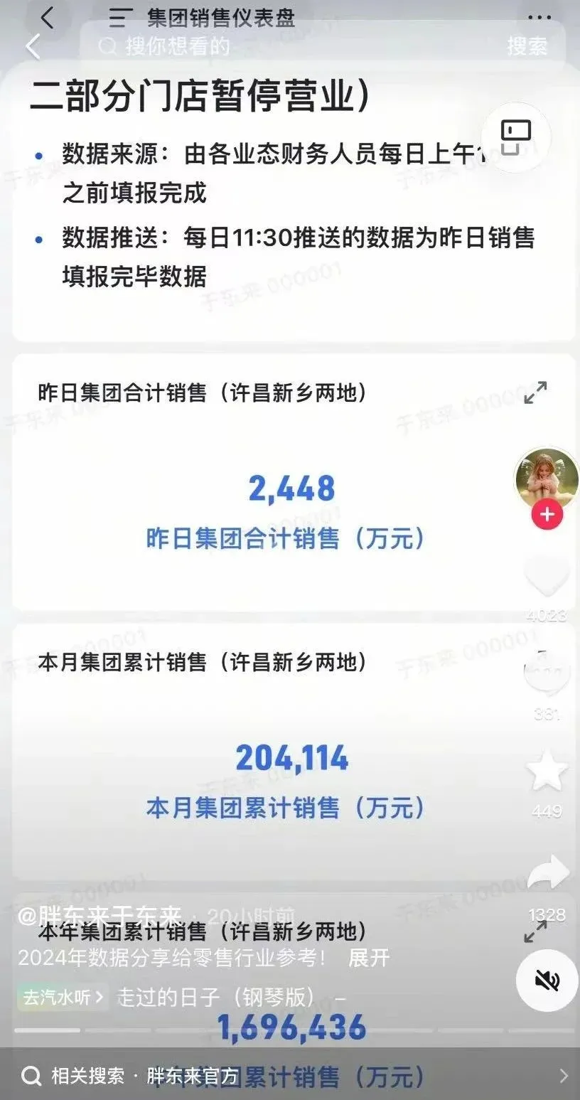 此前的1月1日,于东来就立即发布了2024年胖东来的经营数据。胖东来商贸集团2024年全年累计销售169.64亿元(许昌、新乡两地),12月单月集团累计销售20.41亿元。
