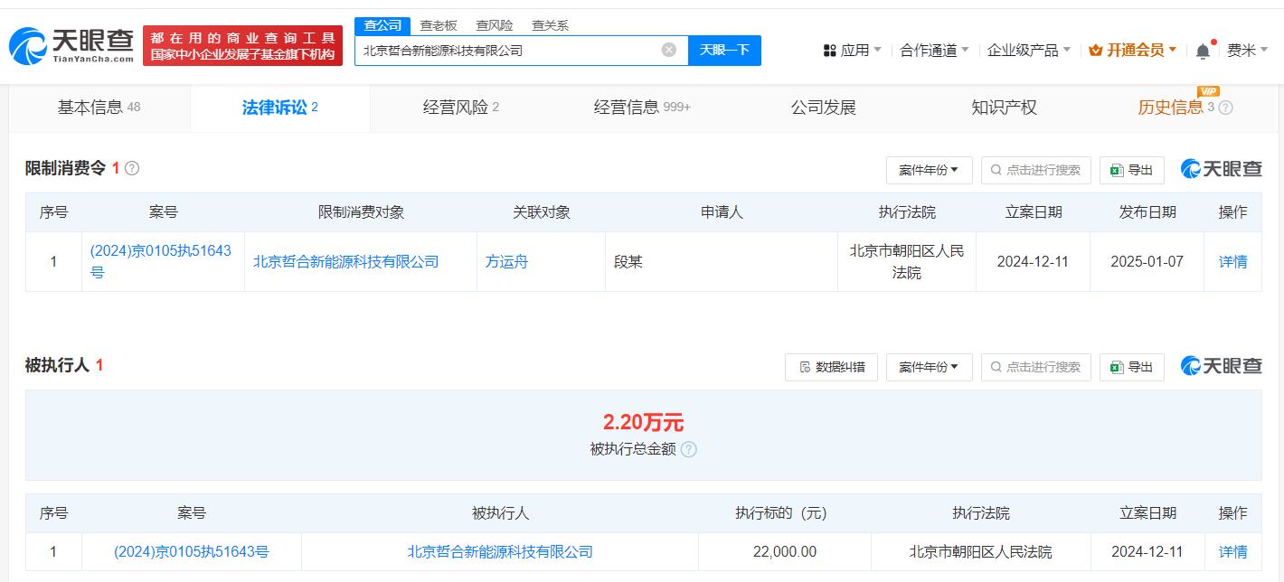 【大河财立方消息】天眼查深度风险信息显示,近日,因未按执行通知书指定的期间履行生效法律文书确定的给付义务,北京哲合新能源科技有限公司及方运舟被限制高消费,涉及劳动争议案件,执行法院为北京市朝阳区人民法院,案件流程信息显示,去年12月,北京哲合新能源科技有限公司已因此案被强制执行2万余元。
