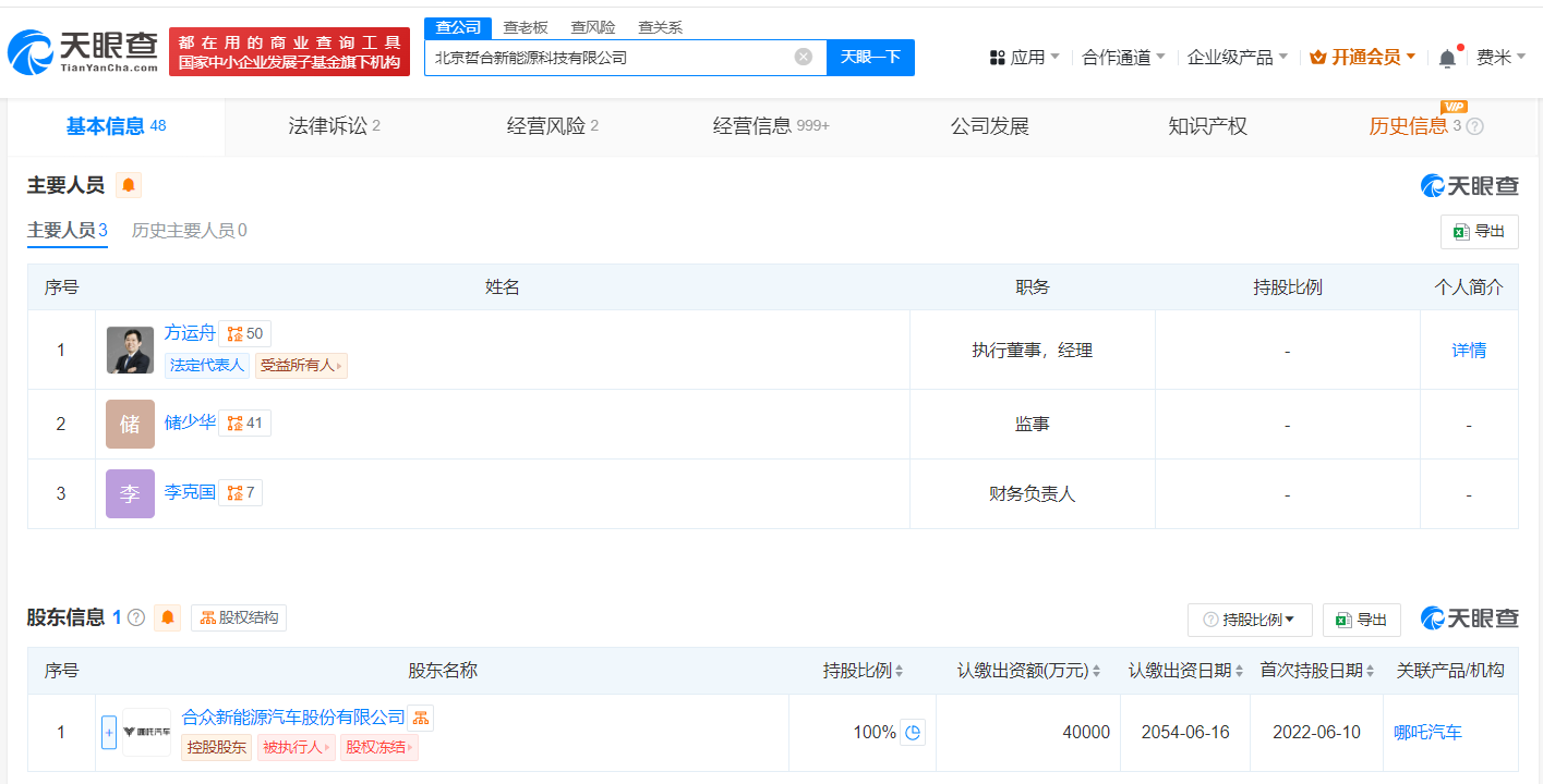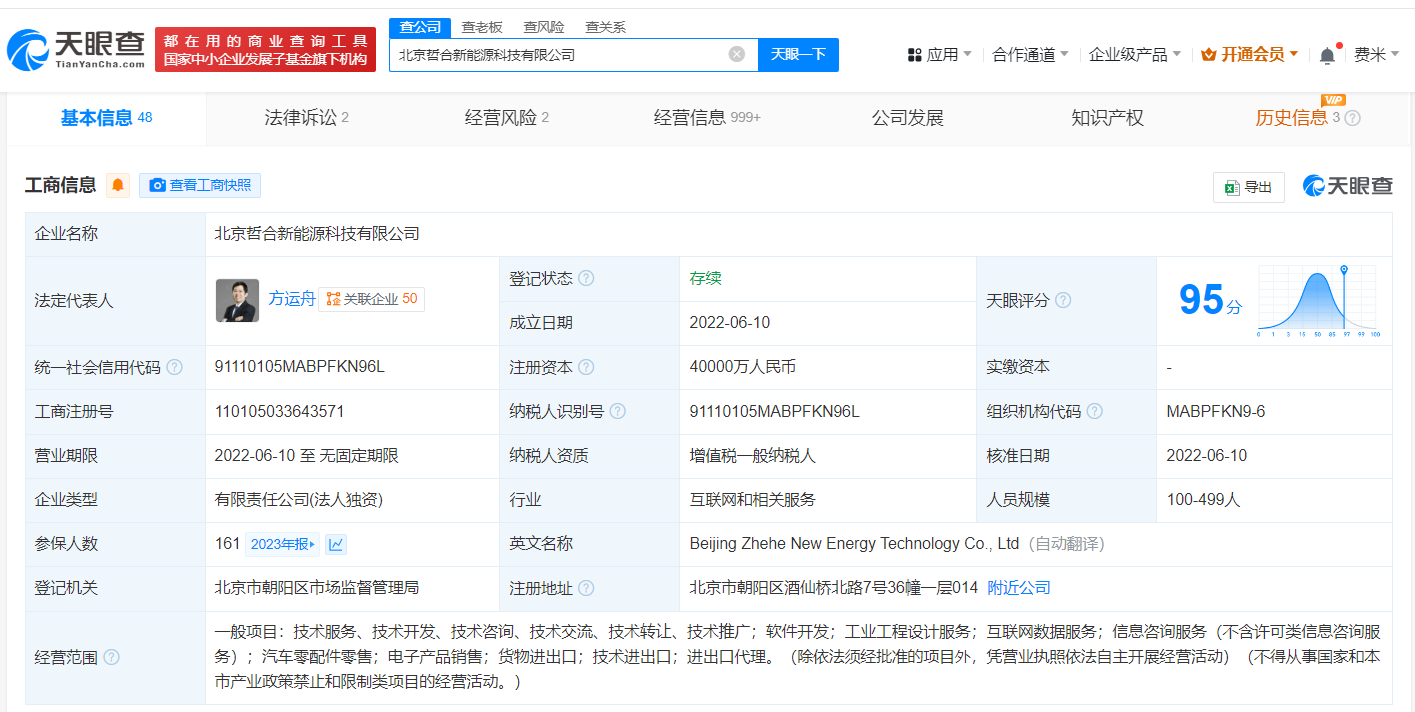 北京哲合新能源科技有限公司成立于2022年6月,法定代表人为方运舟,注册资本4亿人民币,经营范围含软件开发、工业工程设计服务、互联网数据服务、信息咨询服务、汽车零配件零售、电子产品销售等,由哪吒汽车关联公司合众新能源汽车股份有限公司全资持股。