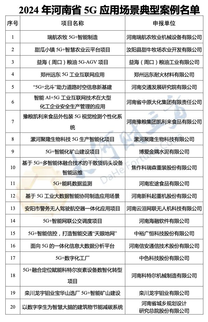 【大河财立方消息】1月9日消息,经单位自愿申报、各地审核推荐、专家评审、河南省工信厅公布2024年河南省5G应用场景典型案例。