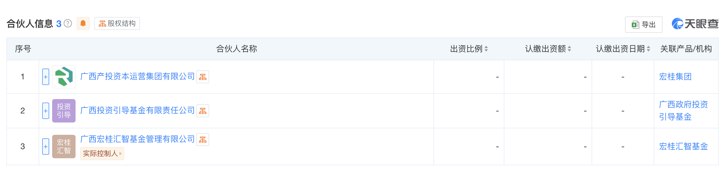 合伙人信息显示,该基金由广西投资引导基金有限责任公司、广西宏桂汇智基金管理有限公司共同出资。后者隶属于广西产投资本运营集团有限公司。