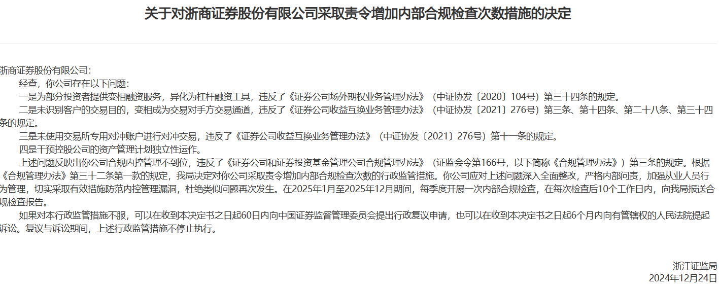 浙江证监局认为,上述问题反映出浙商证券合规内控管理不到位,违反了有关规定,浙江证监局决定对浙商证券采取责令增加内部合规检查次数的行政监管措施。