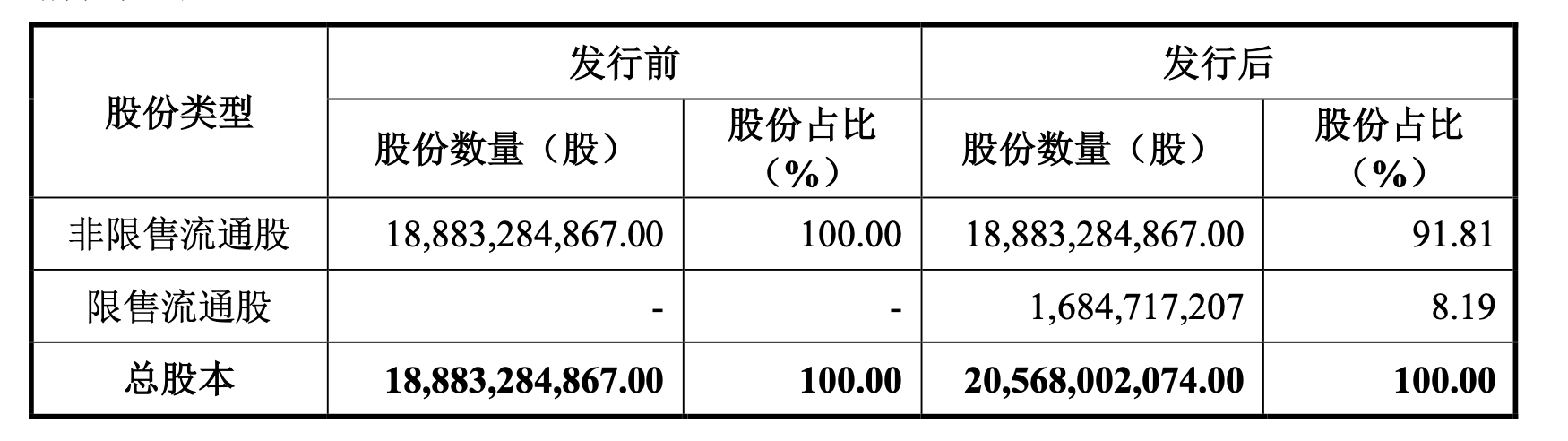 本次发行完成后,中国核电总股本达205.68亿股。其中,非限售流通股188.83亿股,新增限售流通股16.85亿股。上述股份限售流通期限为36个月。