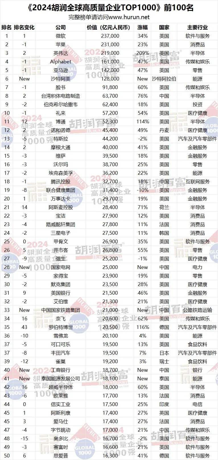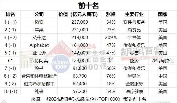 前十名的总价值为139万亿元人民币,占胡润全球高质量企业TOP1000总价值的22%。前十名的平均涨幅为63%。8家来自美国,沙特阿拉伯和中国各有一家,其中沙特阿美是前十名中唯一的国有企业。