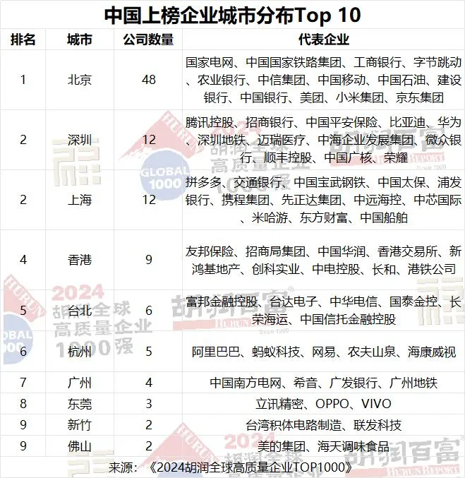 中国上榜企业城市分布中,北京以48家位居第一,深圳为12家,其次为上海、香港、台北等。