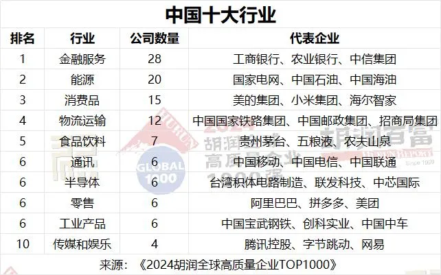 金融服务、能源、消费品、物流运输等位居行业前十,代表企业分别为工商银行、国家电网、美的集团、中国国家铁路集团等。