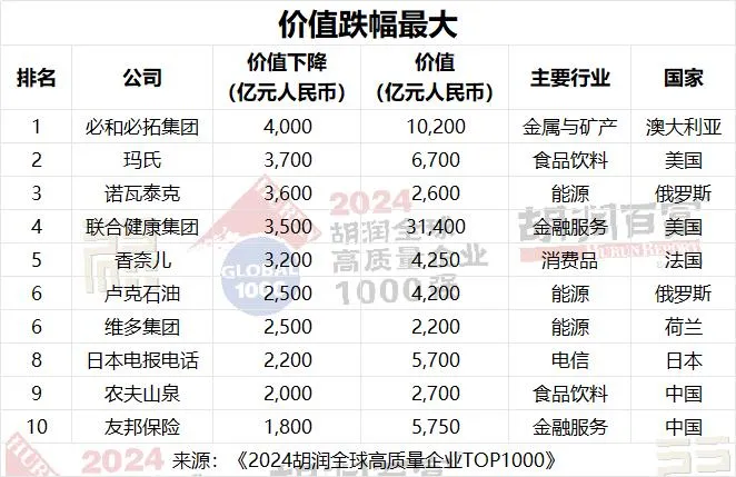 榜单显示,去年上榜的116家公司价值下降,其中澳大利亚矿业巨头必和必拓的价值下降了4000亿元,降至1万亿元人民币,主要受大宗商品价格波动、中国需求减少以及环境成本上升的影响。