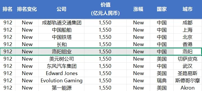 河南共有两家企业上榜,其中总部在南阳的牧原集团,以总价值2000亿元并列第741名,洛阳钼业并列912名,总价值1550亿元。