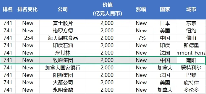 河南共有两家企业上榜,其中牧原集团以总价值2000亿元并列第741名,洛阳钼业并列912名,总价值1550亿元。