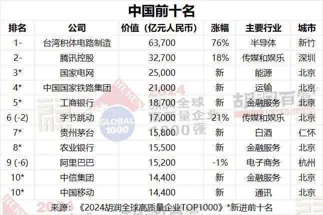 具体到中国企业前十名,分别为台积电、腾讯、国家电网、中国国家铁路集团、工商银行、字节跳动、贵州茅台、农业银行、阿里巴巴、中信集团、中国移动。