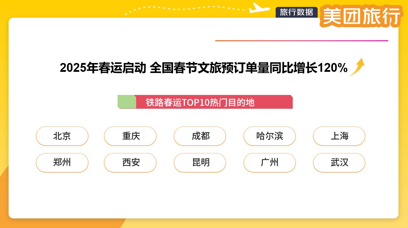 从旅游出行来看,美团旅行上2025年春节,昆明、哈尔滨、贵阳的旅游热度持续走高。截至1月14日,美团平台上昆明春节期间的文旅(含酒店民宿、景点门票、交通等)预订单量同比增长129%,客源多来自成都、重庆、北京、上海、广州、深圳等地。
