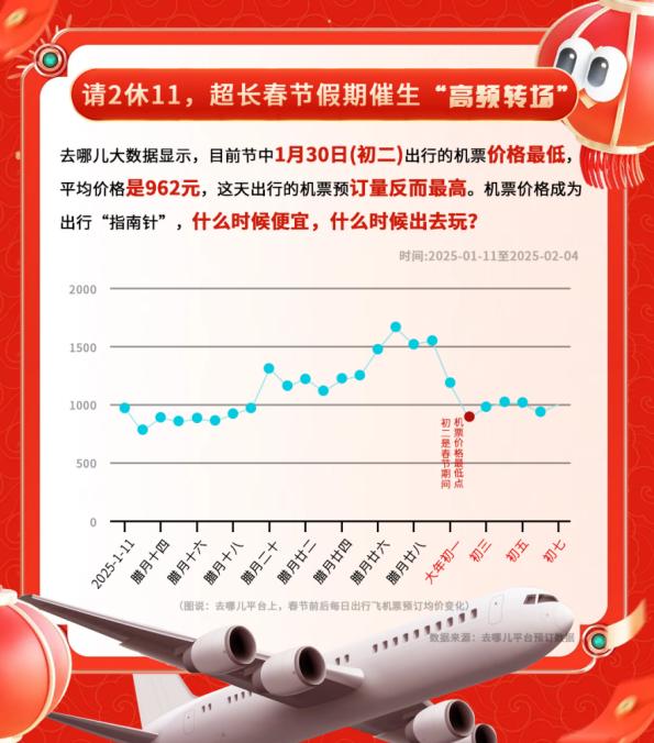 去哪儿大数据显示,目前节中1月30日(初二)出行的机票价格最低,平均价格是962元,这天出行的机票预订量反而最高。足够长的假期,以及较为便宜的机票价格,也让大家春节团圆、出游两不误。