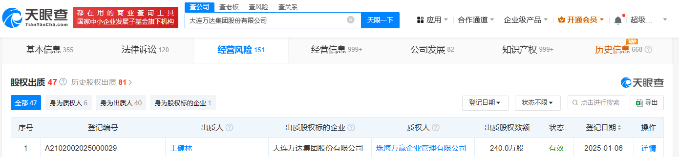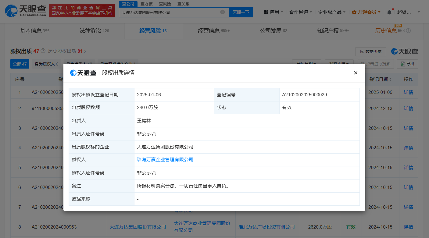 【大河财立方消息】天眼查法律诉讼信息显示,近日,王健林新增1条股权出质信息,出质股权标的企业为大连万达集团股份有限公司,质权人为珠海万赢企业管理有限公司,出质股权数额为240万股。