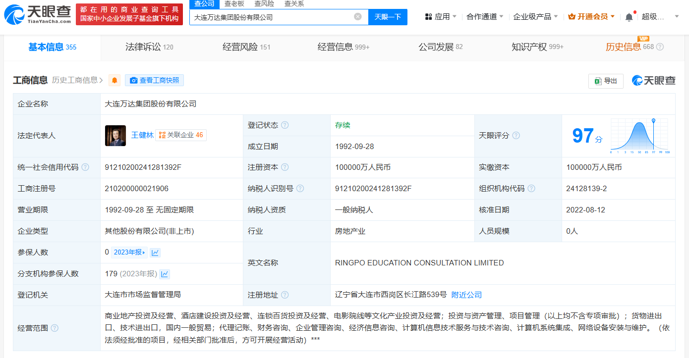 大连万达集团股份有限公司成立于1992年9月,法定代表人为王健林,注册资本10亿人民币,经营范围包括商业地产投资及经营、酒店建设投资及经营、连锁百货投资及经营、电影院线等文化产业投资及经营,由大连合兴投资有限公司、王健林共同持股。天眼风险信息显示,该公司存在多条股权冻结和股权出质信息。