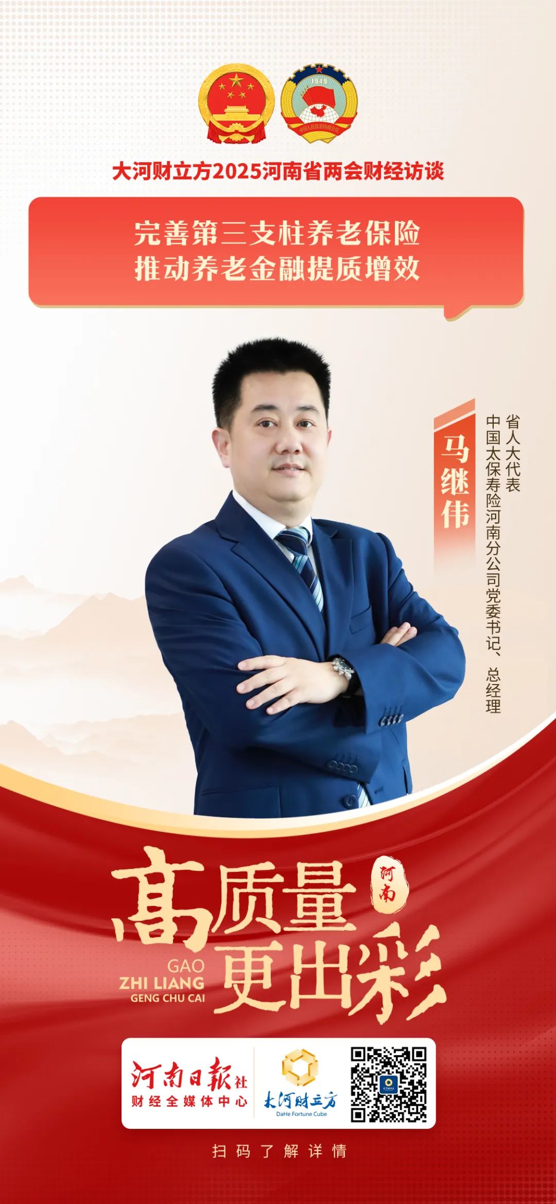 在河南省两会即将召开之际,省人大代表,中国太保寿险销售总监,河南分公司党委书记、总经理马继伟接受了大河财立方记者专访。他表示,在当前我国人口老龄化趋势下,应从强化监管引领、加大政策支持力度、提升公众认知等方面,完善第三支柱养老保险,推动养老金融提质增效。