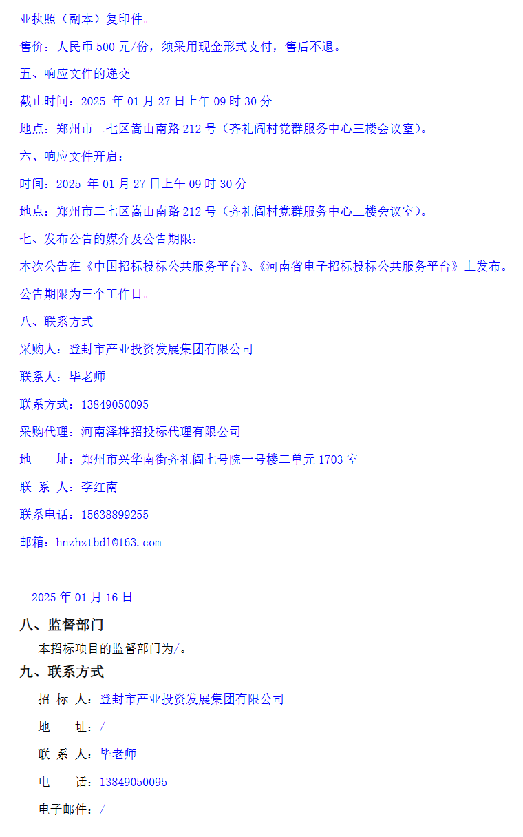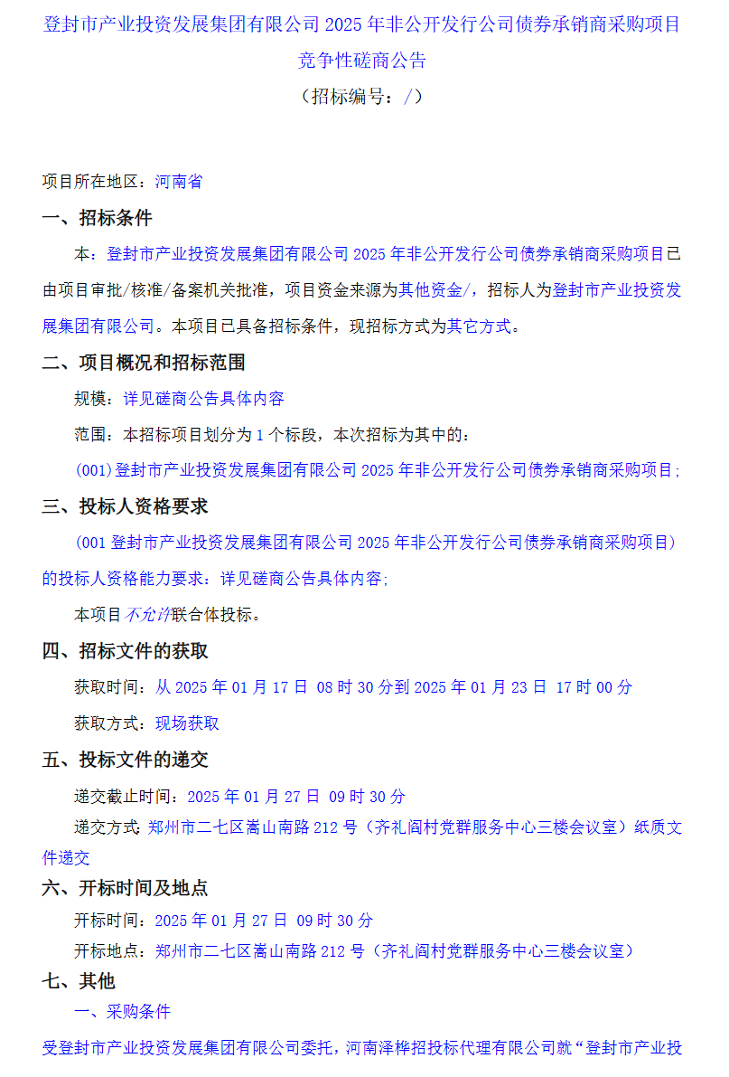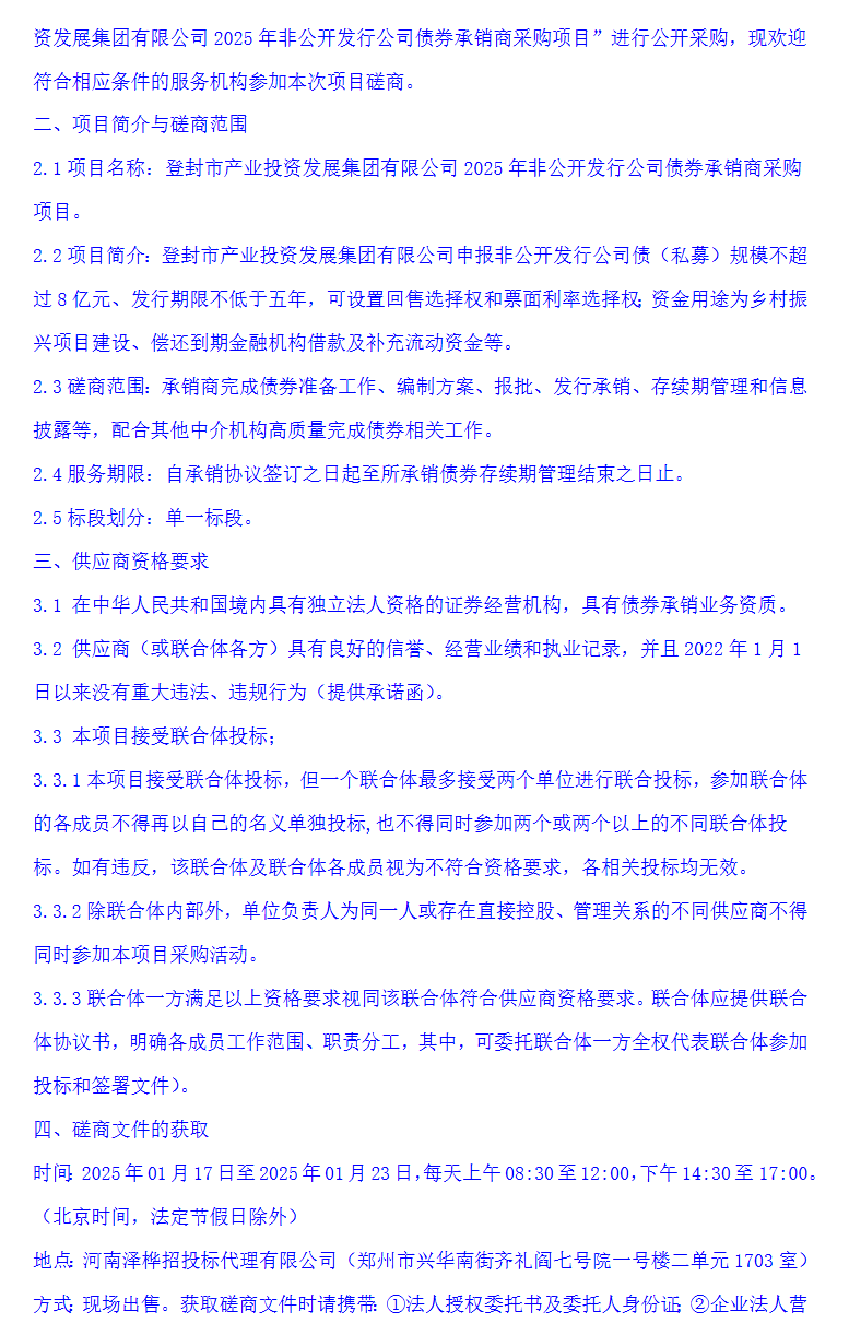 【大河财立方消息】1月16日,登封市产业投资发展集团公告,就2025年非公开发行公司债券承销商采购项目招标。