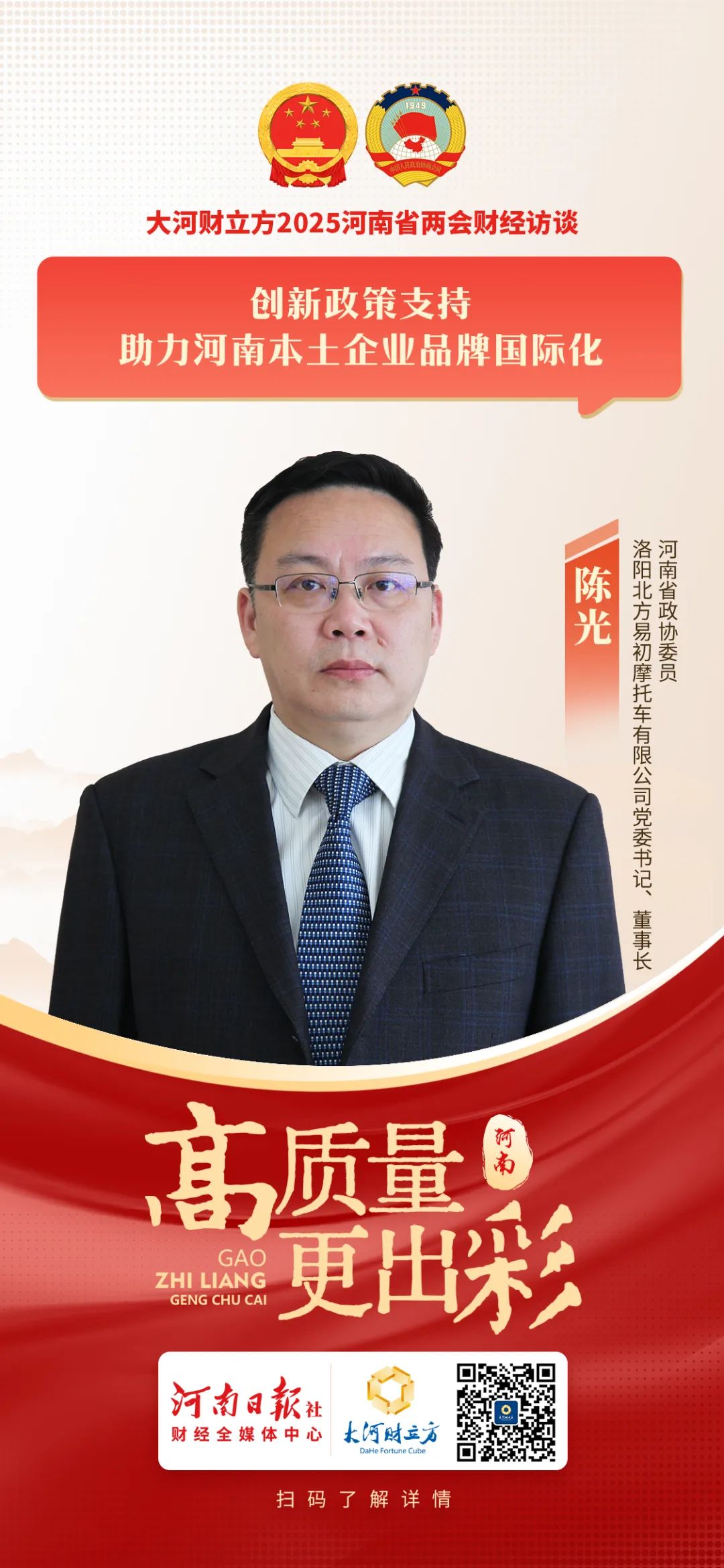 【大河财立方 记者 唐朝金】“我今年带来的建议主要是希望出台相关政策,鼓励、支持河南省本土企业‘品牌国际化’,帮助更多河南本土企业实现品牌出海。”河南省政协委员、洛阳北方易初摩托车有限公司(以下简称洛阳北易)党委书记、董事长陈光在接受大河财立方记者采访时表示。