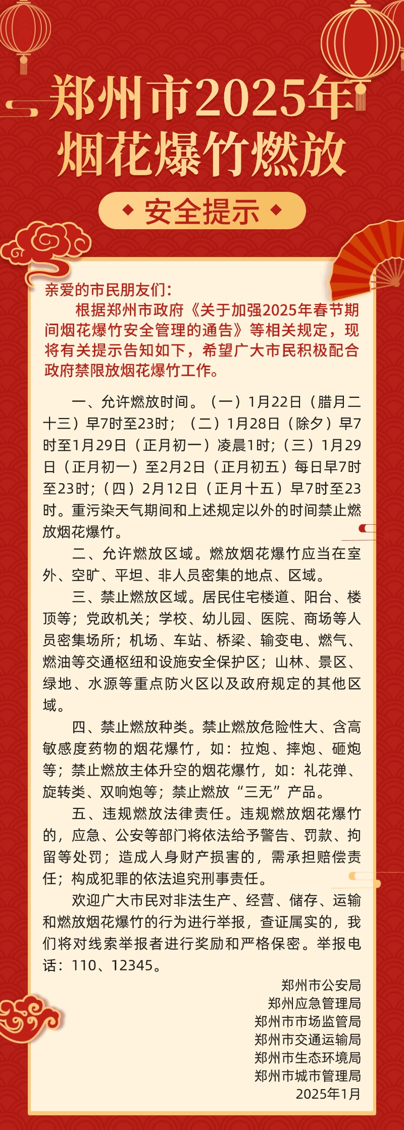 【大河财立方 记者 程帅星】1月17日,记者获悉,近日,郑州市公安局、郑州市应急管理局等部门联合发布《郑州市2025年烟花爆竹燃放安全提示》(以下简称《提示》),明确了烟花爆竹允许燃放时间、允许燃放区域、禁止燃放区域等,并提示了违规燃放法律责任。