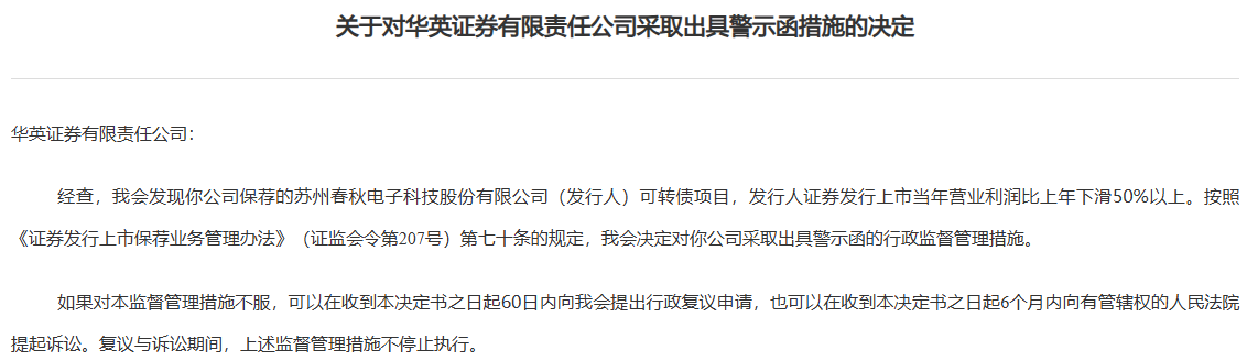 经查,证监会发现华英证券保荐的苏州春秋电子科技股份有限公司(发行人)可转债项目,发行人证券发行上市当年营业利润比上年下滑50%以上。