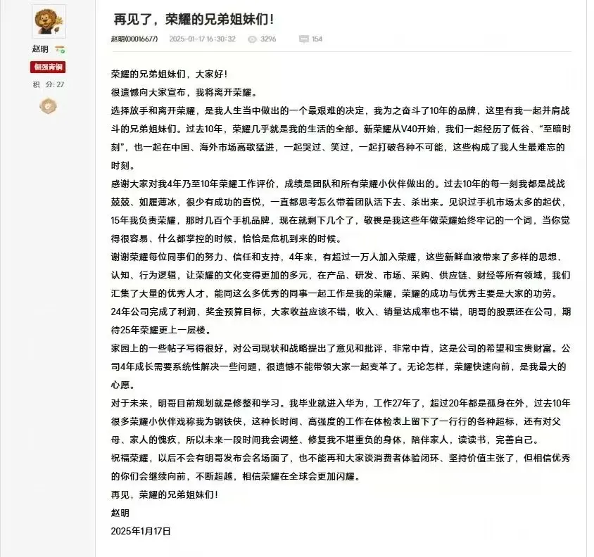 不过,赵明在离职信中表示:“2024年公司完成了利润、奖金预算目标,大家收益应该不错,收入、销量达成率也不错,明哥的股票还在公司,期待25年荣耀更上一层楼。”