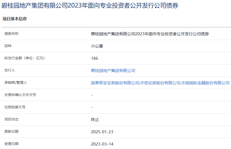 【大河财立方消息】1月23日,上交所债券项目信息平台显示,碧桂园地产集团有限公司2023年面向专业投资者公开发行公司债券项目状态已更新为“终止”。