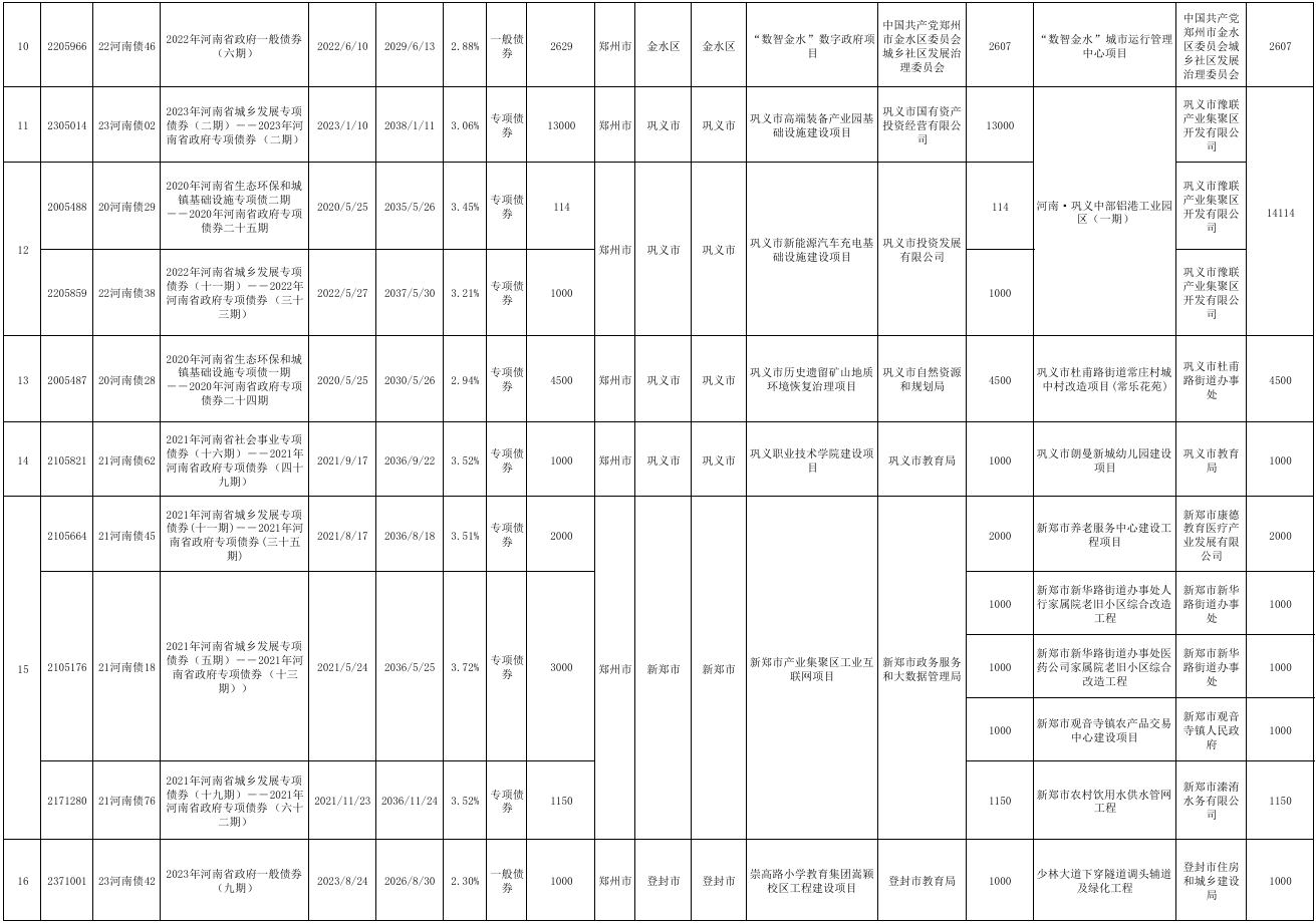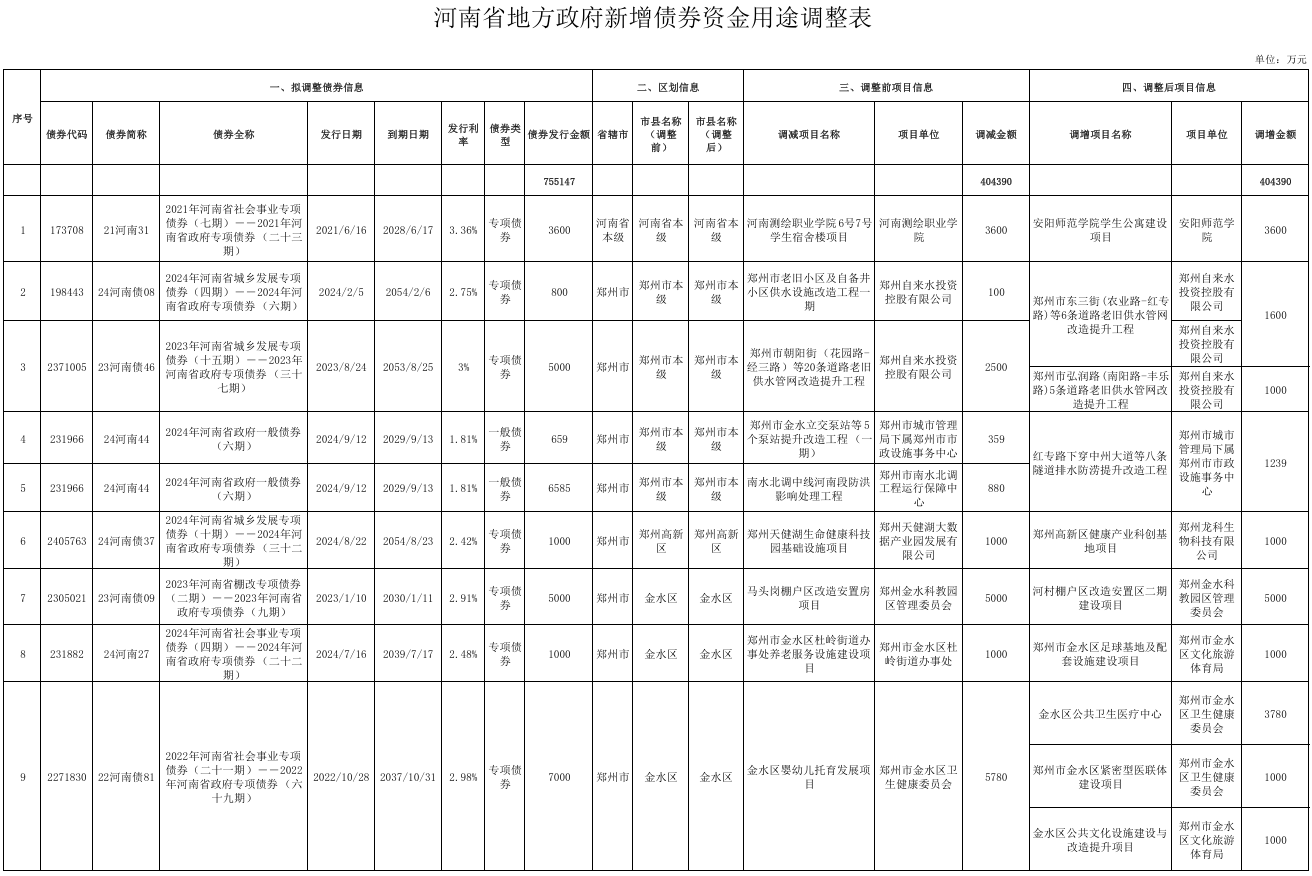根据河南省财政厅提供的资料,本次拟进行募集资金用途调整的债券中,专项债券54只,债券余额合计约3910.46亿元,涉及资金用途调整的金额合计31.83亿元;一般债券7只,债券余额合计约804.99亿元,涉及资金用途调整的金额合计8.61亿元。本次募集资金用途调整共涉及124个项目,涉及金额合计40.44亿元。