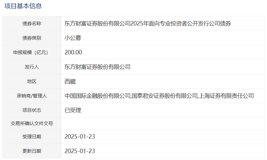 【大河财立方消息】1月24日消息,东方财富证券股份有限公司2025年面向专业投资者公开发行公司债券项目,日前已获深交所受理。