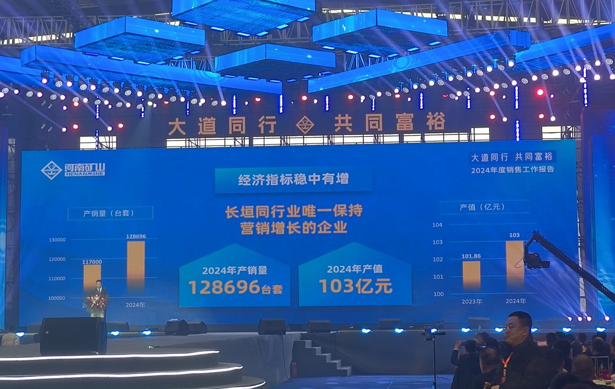 【大河财立方 记者 史冰倩 文 马腾飞 摄影】1月25日,在河南省矿山起重机有限公司2024年度年会现场,河南矿山总裁魏学明作2024年度销售工作报告。他表示,河南矿山全年起重机产销量超过128696台(套),产值高达103亿元,是长垣同行业唯一保持营销增长的企业。