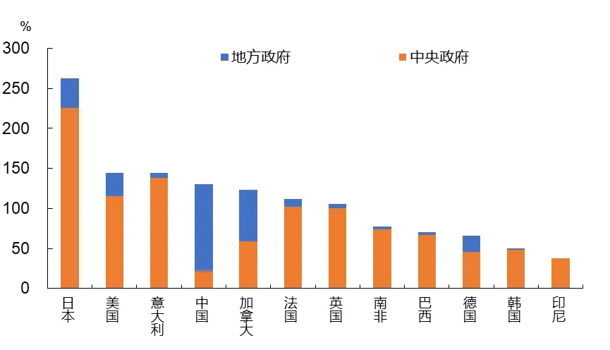 从上图中可以发现,大部分西方国家政府债务的构成中,中央政府的债务要占政府总债务的80%以上,我国中央政府的杠杆率水平只有22%.